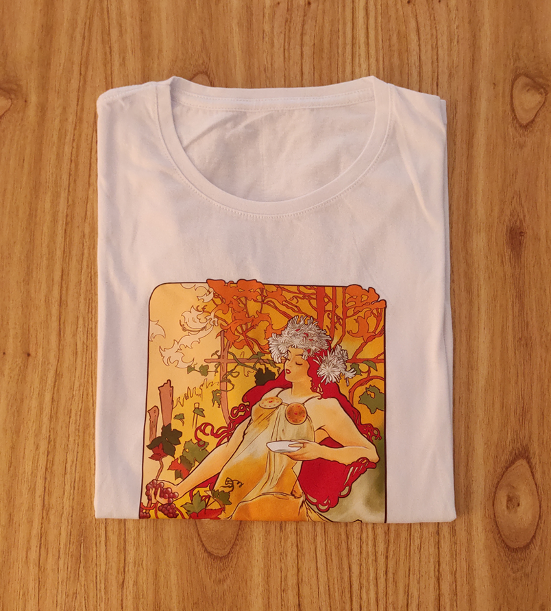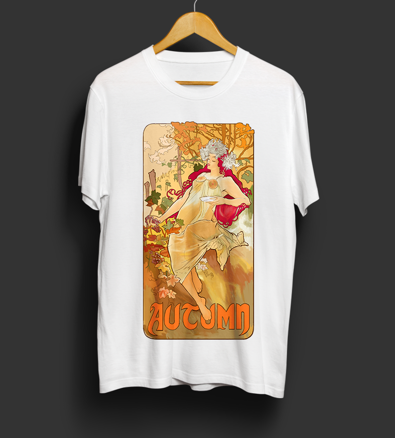 Remera Art Nouveau inspirada en la obra «Autumn» del artista Alphonse Mucha, rediseñada al estilo de Forjando Fuego.